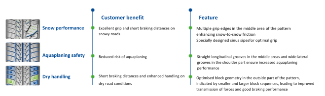 - Rubber compound: A specially formulated rubber compound provides flexibility in different temperatures, optimizing performance in both summer and winter conditions.